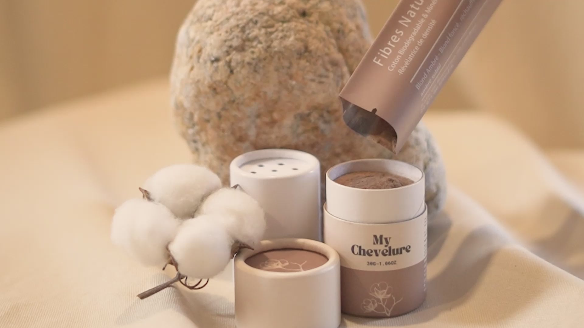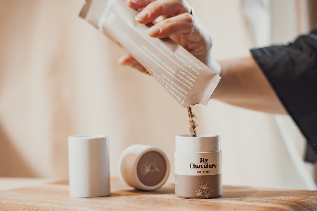 My Chevelure est une poudre à base de fibres de coton végétales et de poudres minérales, pensée comme un geste doux, personnalisable et rechargeable.
